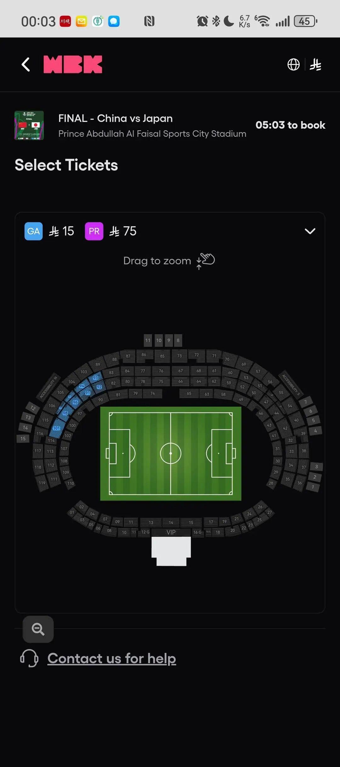 记者在本届U23亚洲杯官方购票平台WeBook注意到,本场比赛的举办场地、能容纳27000人的费萨尔王子体育场将开放东看台售票,分为两档球票,分别为15沙特里亚尔(约合人民币27.86元)的普通票和75沙特里亚尔(约合人民币139.28元)的高档票。注册用户需要先选择自己支持的球队,然后在指定区域购票。